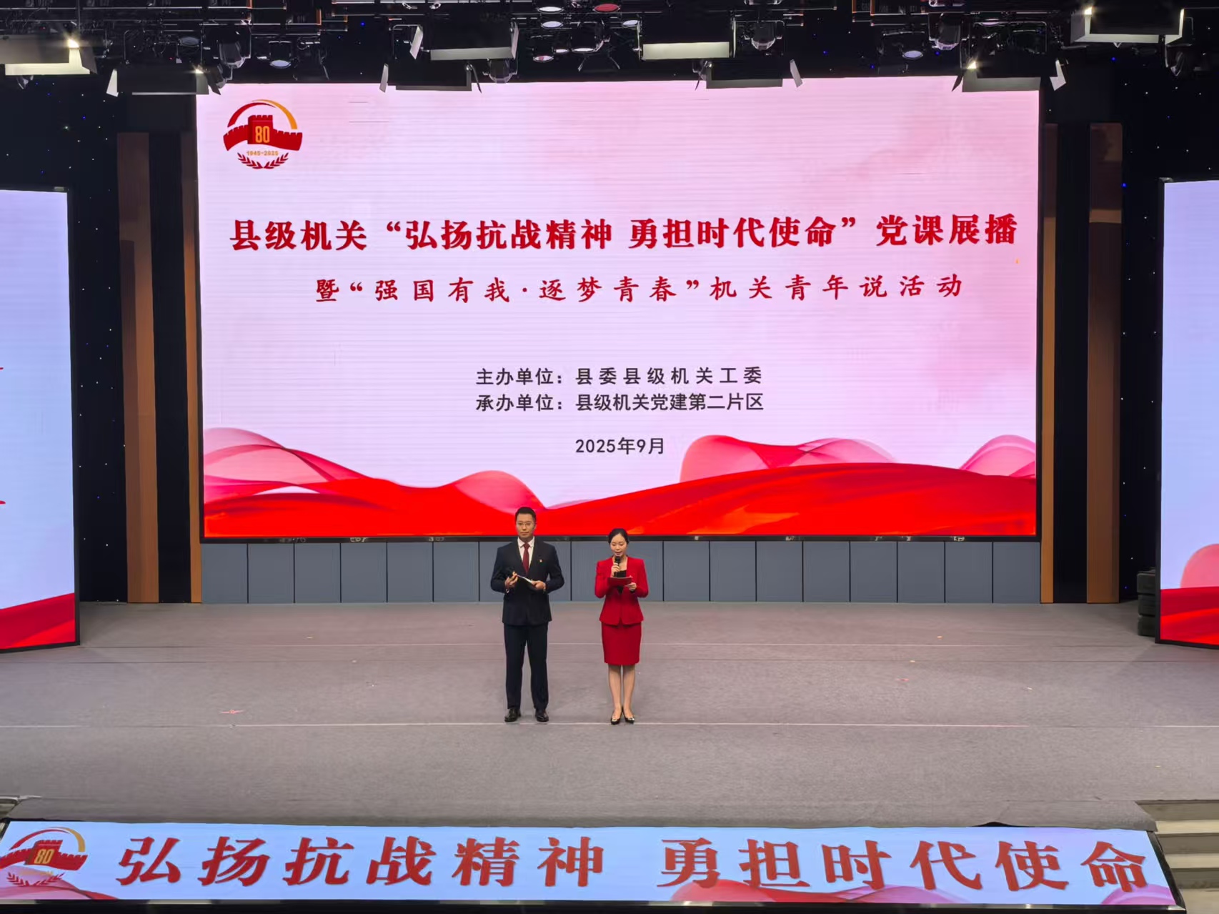 在中國人民抗日戰爭暨世界反法西斯戰爭勝利80周年之際,為深入學習貫徹習近平新時代中國特色社會主義思想,大力弘揚偉大抗戰精神,9月3日下午,由泗洪縣委縣級機關工委主辦、機關黨建第二片區承辦的縣級機關“弘揚抗戰精神 勇擔時代使命”黨課展播暨“強國有我?逐夢青春”機關青年說黨建第二片區活動在縣融媒體中心演播廳成功舉辦。泗洪縣委常委、組織部部長趙鵬程出席活動,縣委宣傳部、縣委縣級機關工委、縣委黨校、縣融媒體中心相關領導,機關黨建第二片區18家成員單位及其他4個片區牽頭單位分管領導、青年黨員代表,機關單位黨務工作者參加活動。